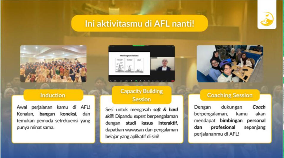 Kamu akan mengikuti Induction, Capacity building, Special Track Pitching, Coaching Session, dan Graduation. Untuk tau penjelasannya kamu bisa lihat di bit.ly/AFLSP25Booklet